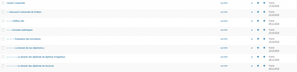 Premièrement, cela va vous aider à vous y retrouver dans l’administration de votre site, car les pages seront classées en fonction de leur position dans l’arborescence, et visuellement identifiables par les traits qui apparaissent devant les titres de pages :