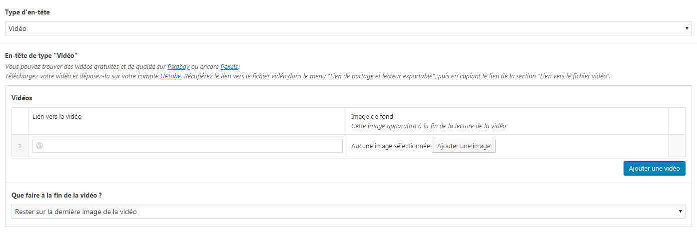 Cette option vous permet d’afficher une vidéo en fond de votre en-tête de page. Initialement réservée aux entêtes en pleine hauteur, elle est maintenant disponible sur toutes les hauteurs d’en-tête. Trois champs sont à renseigner :