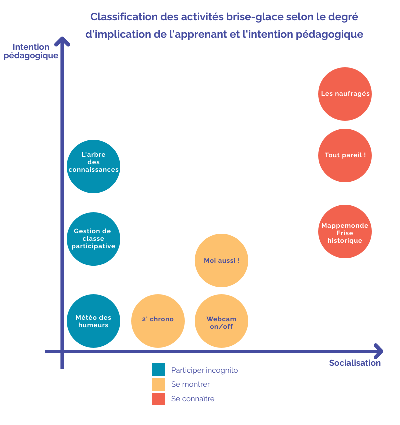 Le 9 mars dernier, le Pédagolab organisait un webinaire d’initiation à cette pratique, où l’on pouvait découvrir neuf activités différentes classées en 3 catégories selon des critères d’objectifs pédagogiques et de progressivité dans le « dévoilement » : Participer incognito, Se montrer, Se connaître.