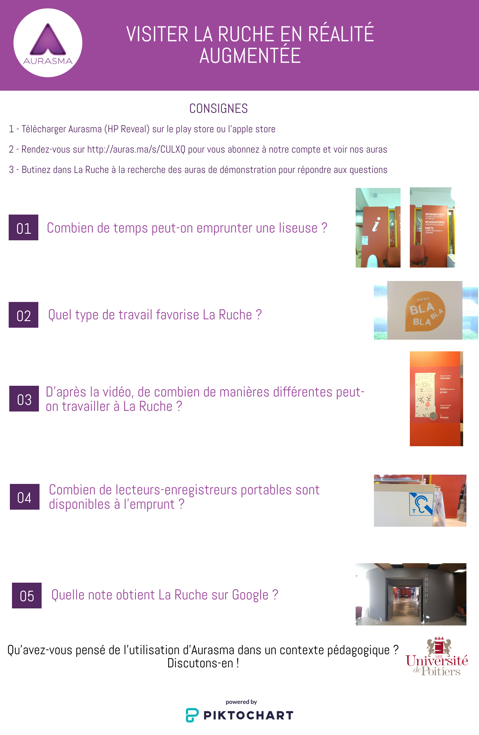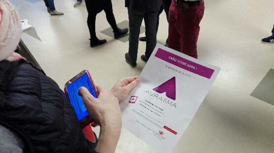Après une rapide présentation de ce qu’est la Réalité augmentée, une feuille de route a été remise aux participant.e.s. Elle contenait les consignes pour installer l’application sur leur équipement mobile, ainsi que quelques questions auxquelles ils étaient invités à répondre en butinant dans la Ruche pour trouver les réponses.