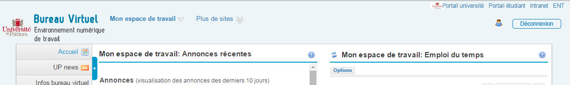 L’environnement numérique de travail de l’UP vous permet d’accéder aux services nécessaires à la gestion quotidienne et administrative de votre travail : annuaires de la communauté universitaire, envoi de fichiers volumineux, planification de rendez-vous, emploi du temps… Il est aussi une porte d’entrée vers les autres outils proposés à l’UP.