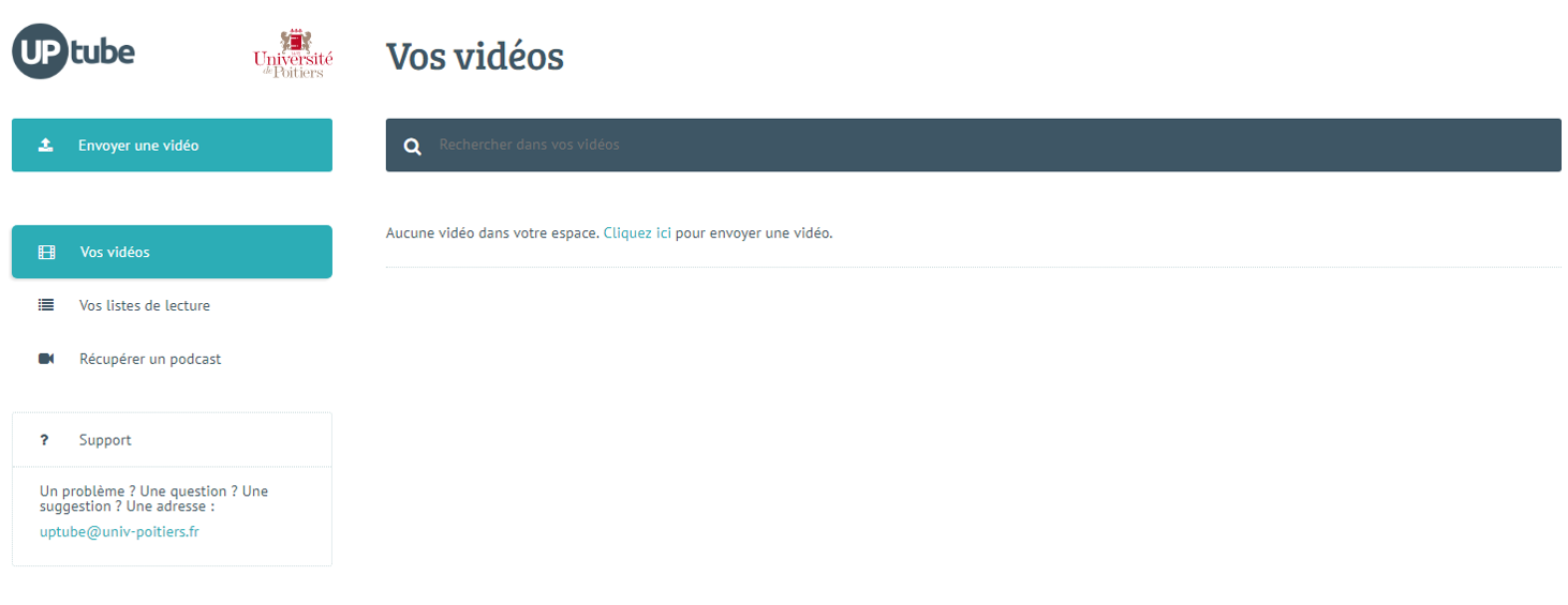 UPtube est une vidéothèque de l'Université de Poitiers qui vous permet le dépôt de fichiers vidéo, l'encodage automatique de ceux-ci et leur partage (sites, plateformes pédagogiques, blogs, etc).